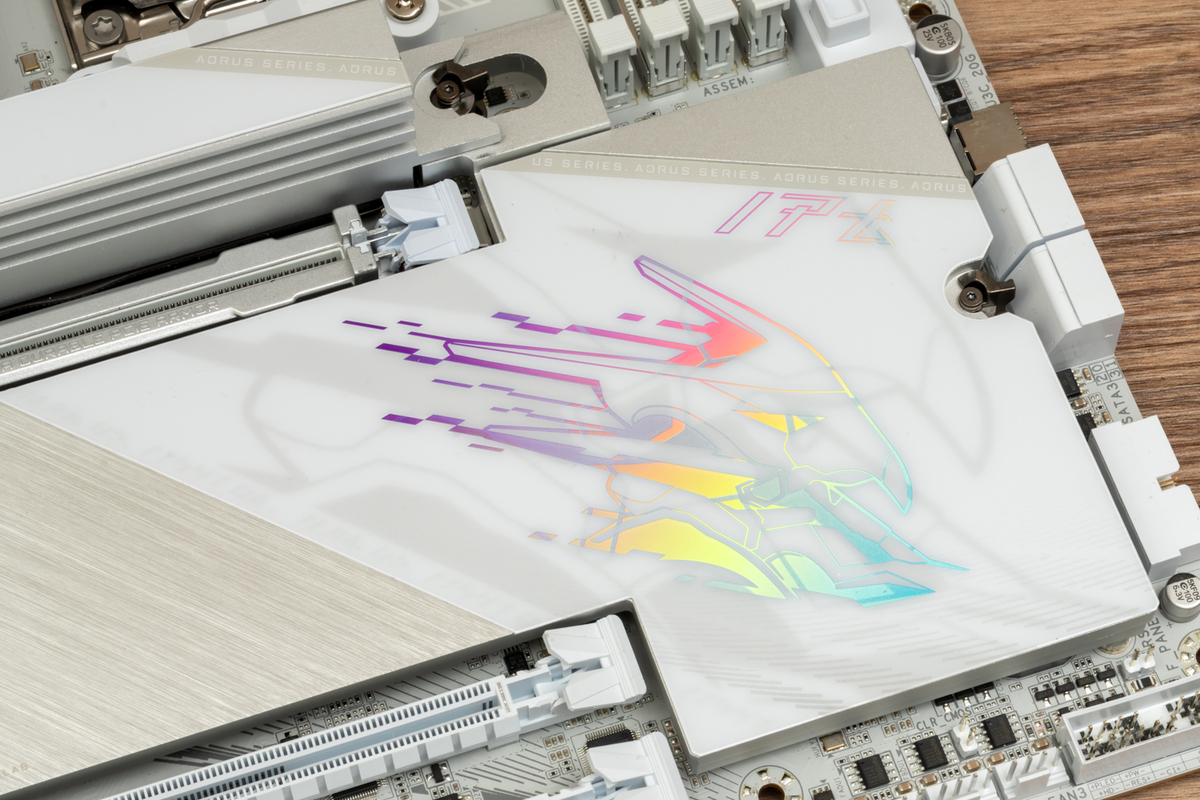 リアインターフェースカバー。AORUSロゴには、発光ギミックが内蔵されている