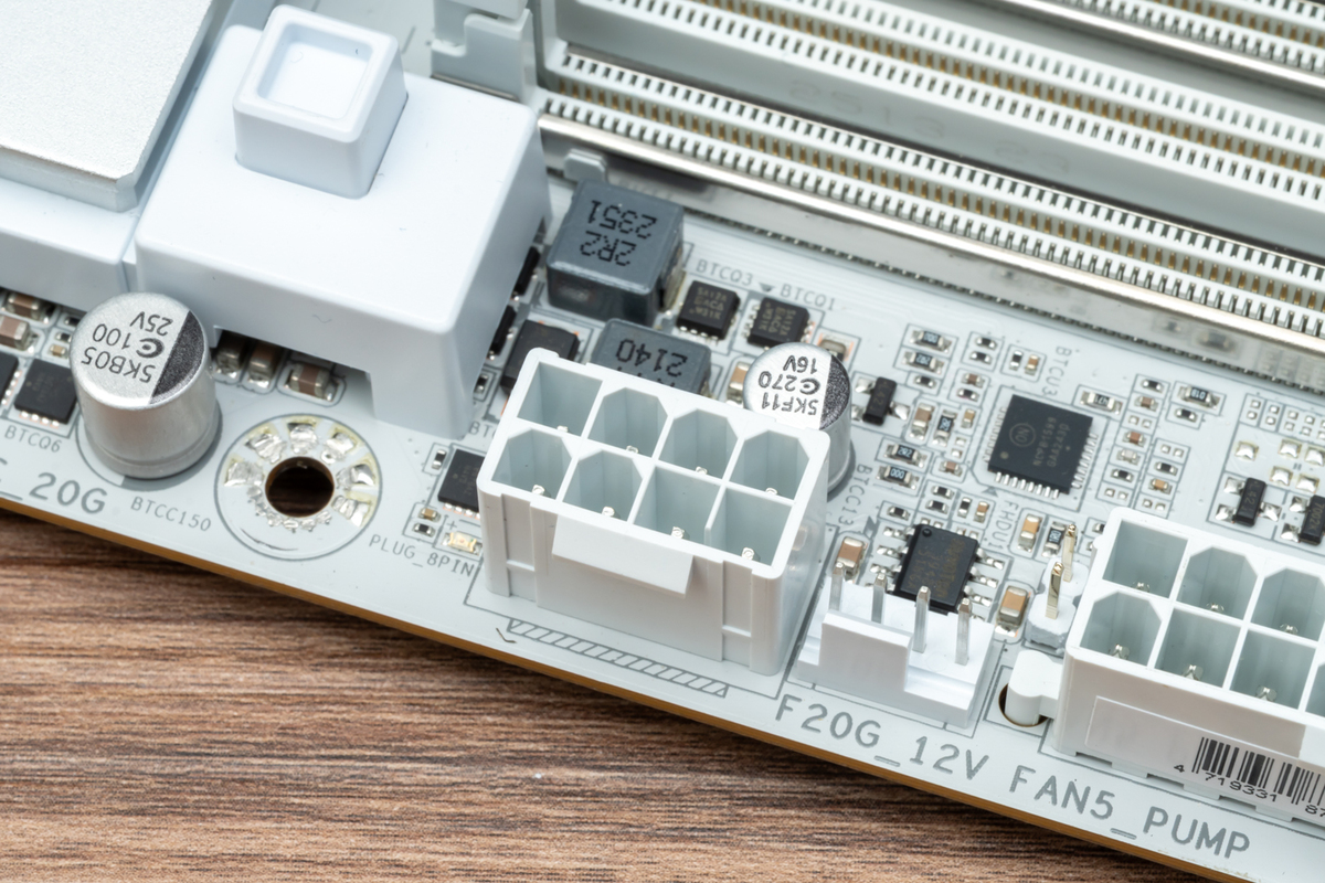 24ピン電源コネクターの隣りには、PCIe 8ピン補助電源コネクターを用意。これは「フロント USB 3.2 Gen 2x2 Type-C」ヘッダピンのQC-USB 65W給電用に必要なもので、電源ケーブルを接続しないと高出力給電が不可となる