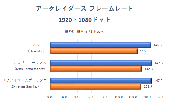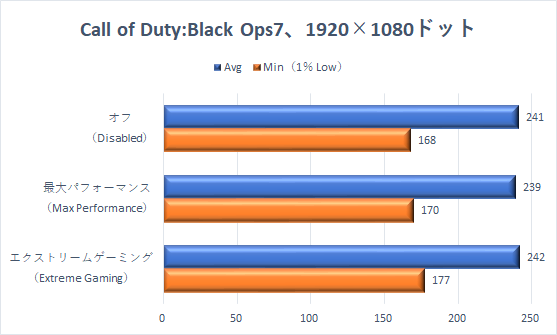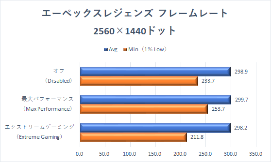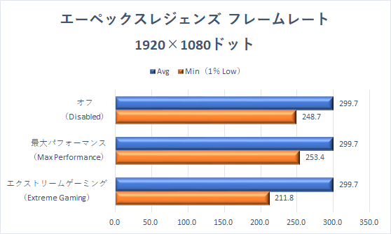 Avgはどのモードでも、上限の300fpsに達するが、Min(1% Low)にはしっかりとチューニングモードによる影響が出ており、最大パフォーマンス>オフ>エクストリームゲーミングモードとなっている。
