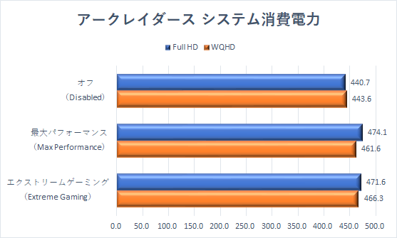 もしかして消費電力が低下する? と期待して、プレイ中のシステム消費電力を確かめたが、結果はそう甘くなく、PPTなどが向上しているだけに、チューニング前のAMD定格動作が、最も消費電力が低くなっていた。