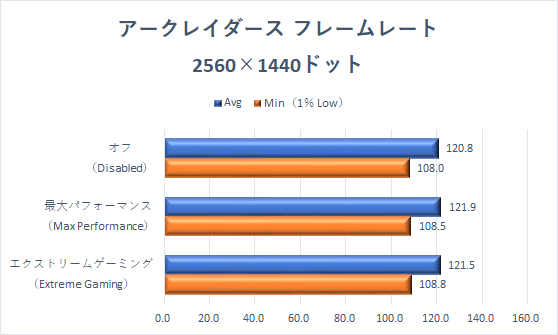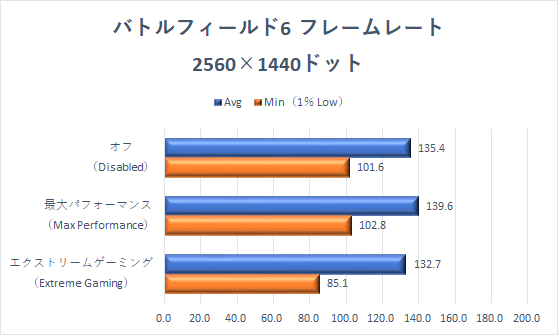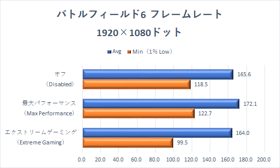 誤差の範疇ではあるが、エクストリームゲーミングモードが、わずかに伸ばしている。試しに、画質プリセットを下げた状態も試したが、傾向は同じだった。