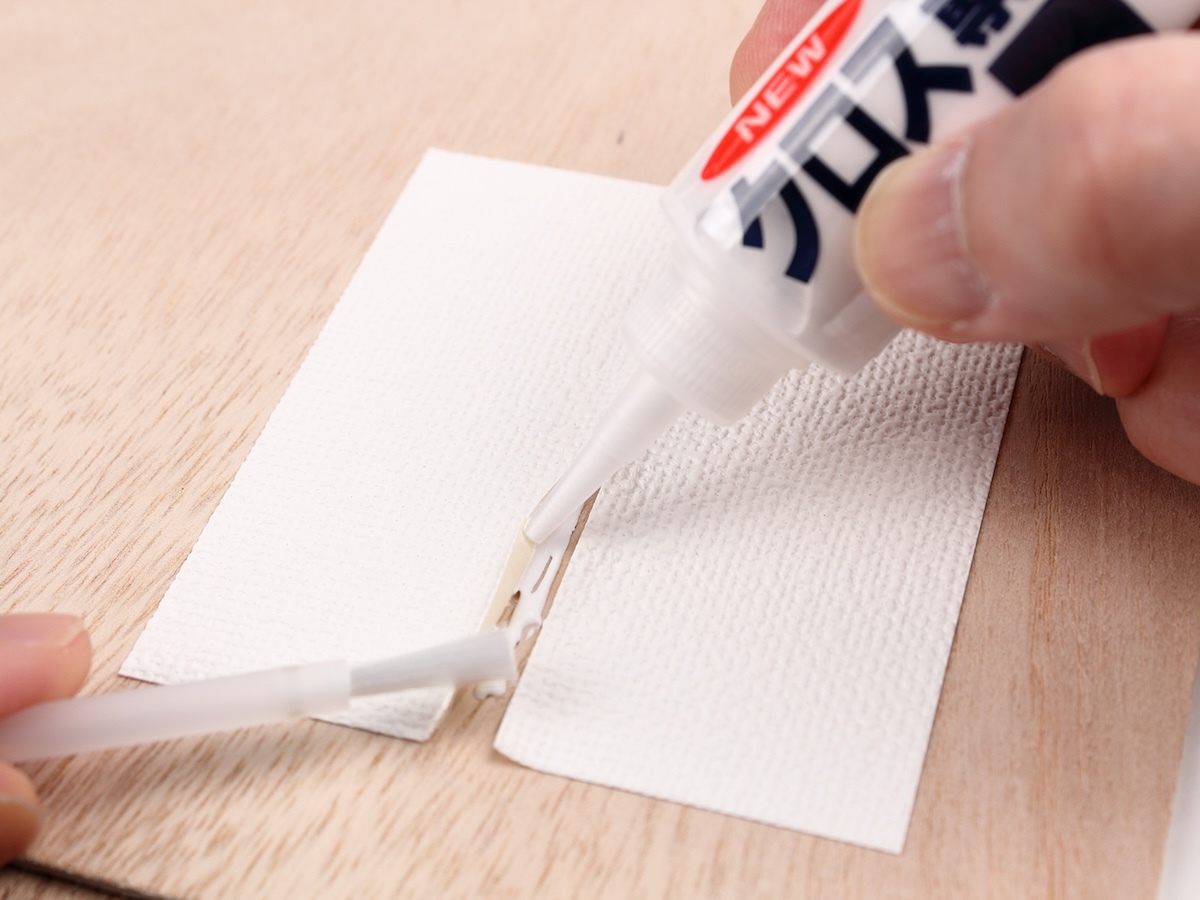 「はがれた壁紙を貼るだけなんだから、手持ちのテキトーな接着剤でいいじゃないか……」と思ってしまいがちですが、これがかなり違います。粘着力が弱いと、数時間から数日以内に再びはがれてしまい、何度も補修を繰り返すうち、ガピガピになってしまうでしょう。また、色の付いた接着剤だとはみ出した部分が目立ちますし、無色でもテカテカになってしまうようなものだと、補修跡がモロバレです。