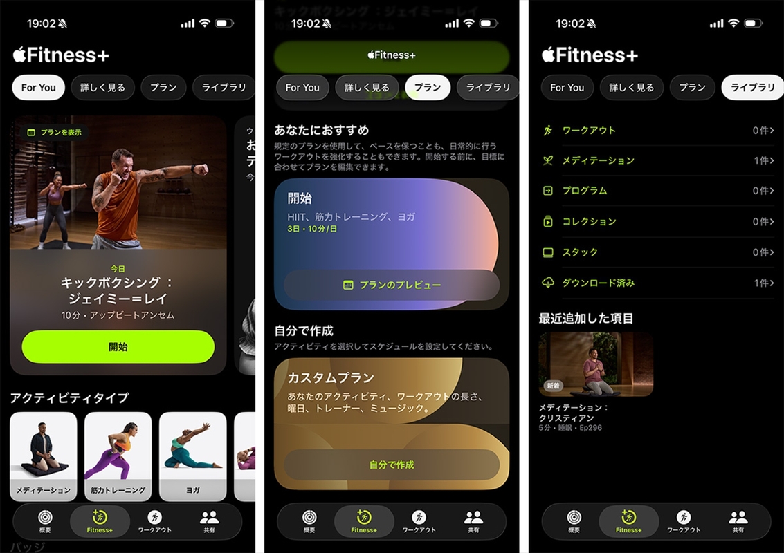 フィットネスアプリを開くと、画面下のタグに「Fitness+」が追加されています。自分のペースに合わせたワークアウトのルーチンを「カスタムプラン」として作る機能や、オンライン通信機能が必要なFitness+のコンテンツを、ダウンロードしてオフラインで実践できる機能も揃っています