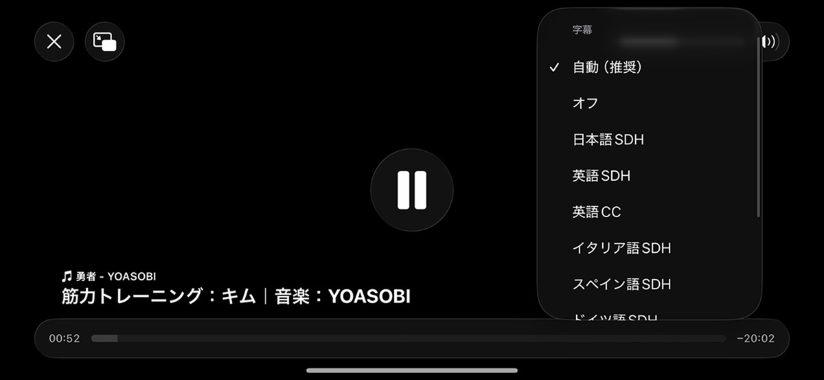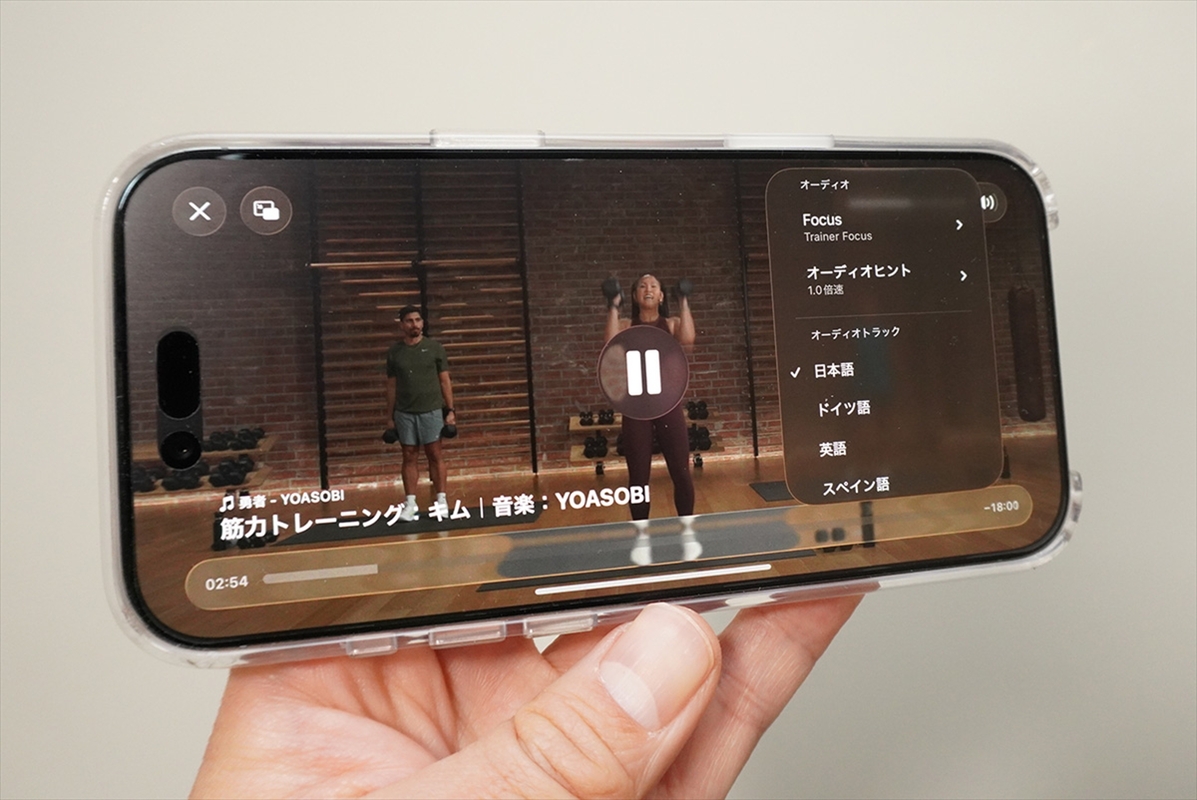 なお、トレーナーが英語で話している生声を聞きながら身体を動かしたい方のため、日本語字幕を表示しながらApple Fitness+を実践する方法もあります。ただ、筆者の経験上、デバイスの画面に表示される文字を見ながら身体を動かすことはなかなか大変です。とても自然なデキ映えなので、翻訳音声ガイドを頼りにしながら身体を動かす方をオススメします。