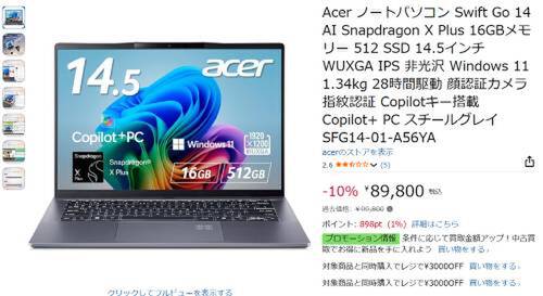 AcerのノートPC「Swift Go 14 AI(SFG14-01-A56YA)」がAmazonで割引対象です。過去価格99,800円のところ、10%オフの89,800円で購入できます。