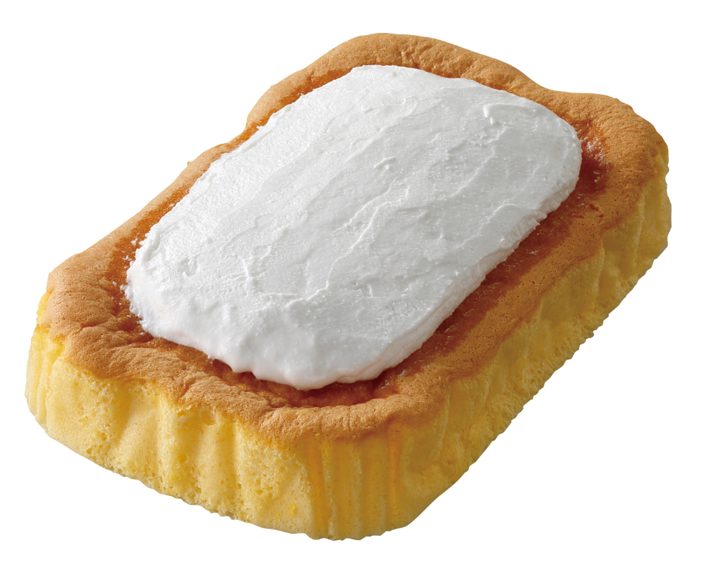 従来品の「ふわもち生シフォン」と比較して、総重量を約50%増量。ふわふわ、もっちり食感のシフォン生地に、北海道産生クリーム入りホイップクリームをたっぷりのせた。
