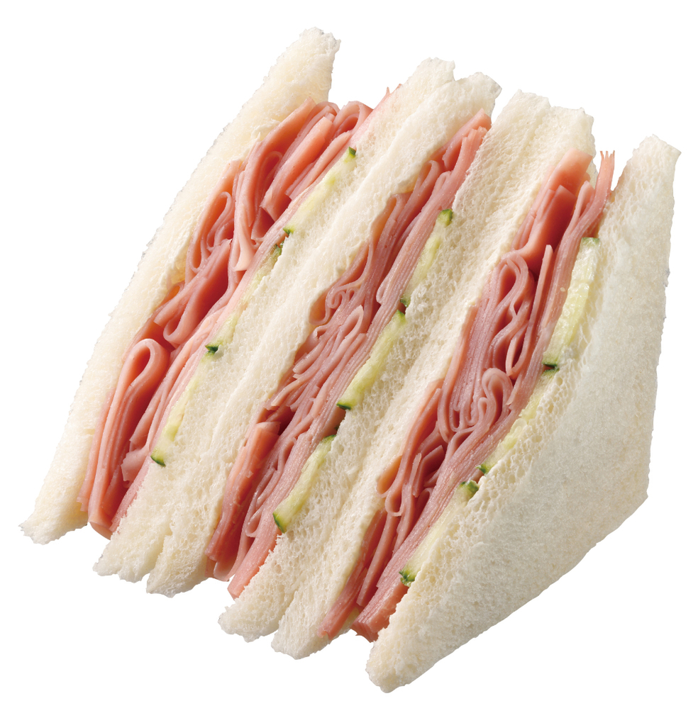 従来品の「ハムサンド」と比較して、ハムを約50%増量。旨みのあるハムを主役に、きゅうりの食感とからしマヨネーズをアクセントにした。