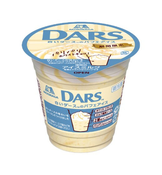 白いダースのパフェアイスは、森永製菓の「白いダース」とコラボレーションした商品です。ミルク風味のソース、ホワイトクランチ、2層仕立てのバニラアイス、パリパリとしたホワイトチョコで構成されています。