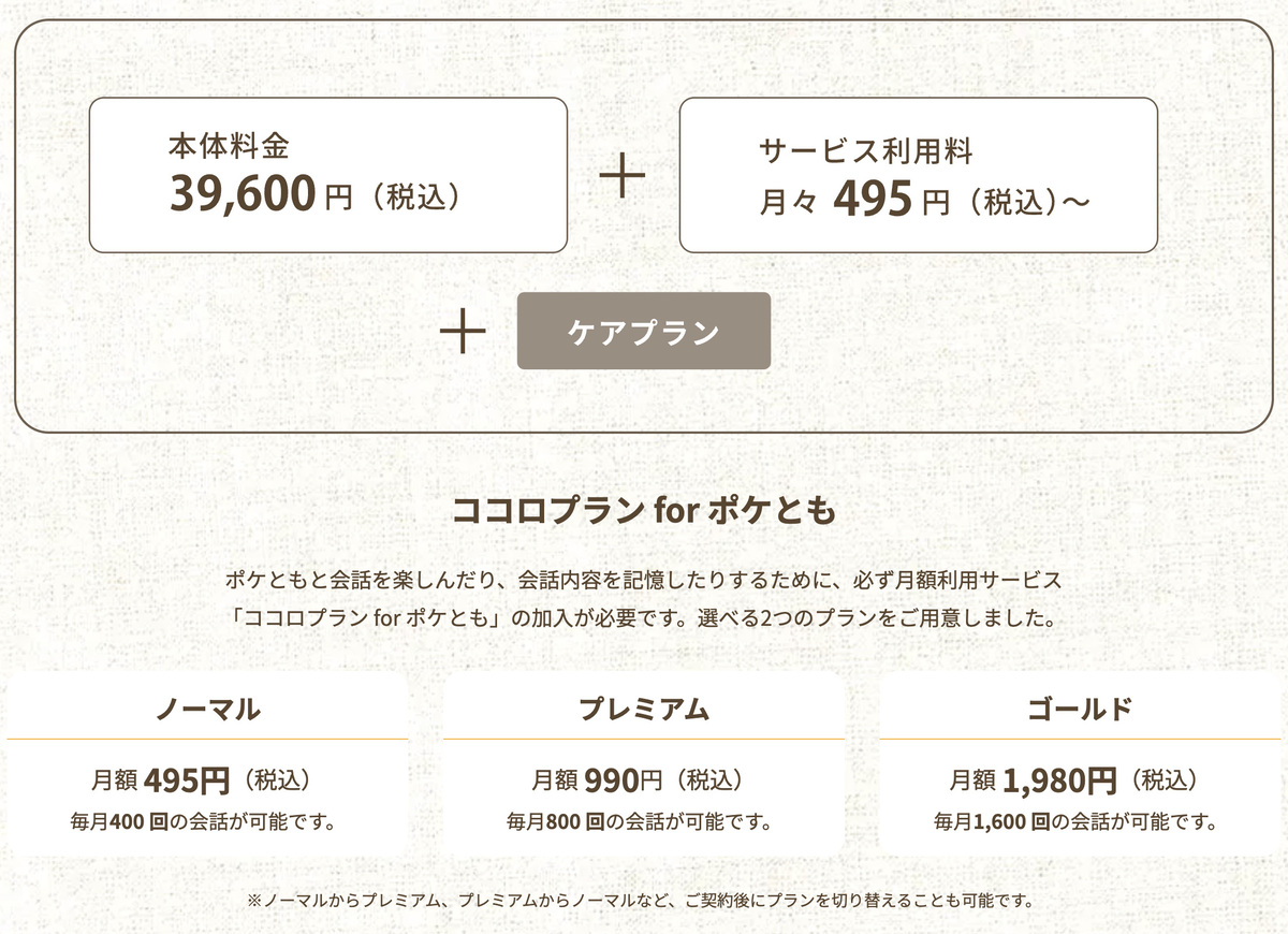 本体価格は4万円以下と、コミュニケーションロボットとしては結構お手頃に感じます。ただ、会話を楽しむには「ココロプラン for ポケとも」への加入が前提になります。月額課金のサービスですが、会話回数に応じてプランが分かれており、無制限ではない点に引っかかりを覚える人もいるかもしれません。維持費がかかるロボットである点は理解しておきたいです。