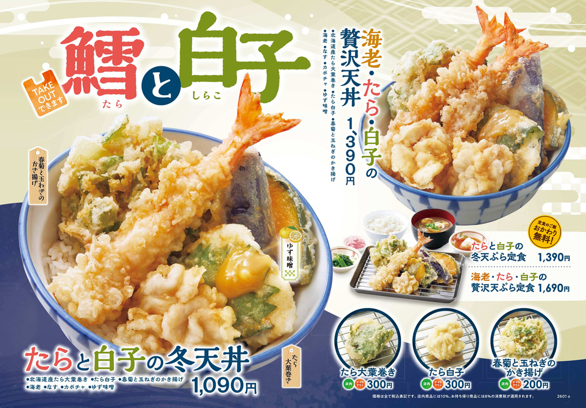鱈と白子を主役にした、この季節ならではの天丼が登場します。海老と白子をそれぞれ1個ずつ増量した贅沢丼も用意され、冬の味覚をたっぷり楽しめるラインアップとなっています。