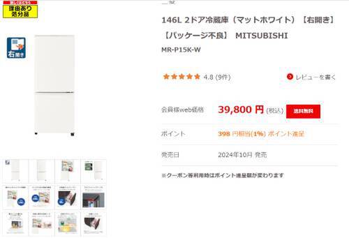 146Lの2ドア冷蔵庫で、単身世帯やセカンド冷蔵庫として選びやすい容量。2024年発売モデルで、比較的新しく、パッケージ不良を理由に価格が抑えられています。