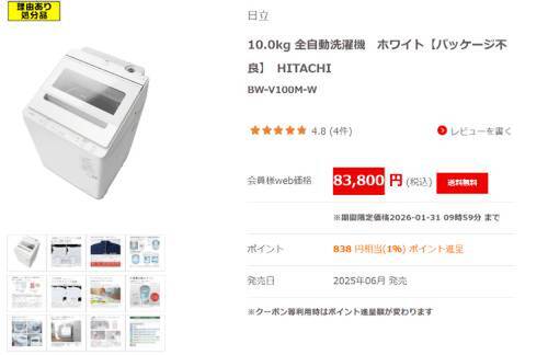 洗濯容量10kgの全自動洗濯機で、家族世帯でも余裕を持って使えるサイズ。2025年発売モデルの在庫処分品という点が特徴で、容量重視の人にとっては価格面も含めて検討しやすい内容です。