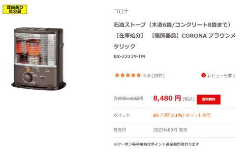 木造6畳、コンクリート8畳まで対応する石油ストーブ。シンプルな構成で、メイン暖房の補助や非常時用としても使いやすいタイプです。1万円を切る価格帯はアウトレットならではといえます。