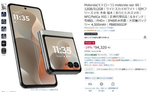 Motorolaの折りたたみスマホ「motorola razr 60」が、Amazonのタイムセール対象になっています。参考価格12万3,455円のところ、24%オフの9万4,320円で販売中です。