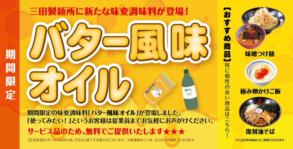 三田製麺所は1月13日より新たな味変調味料「バター風味オイル」の提供を開始した。
