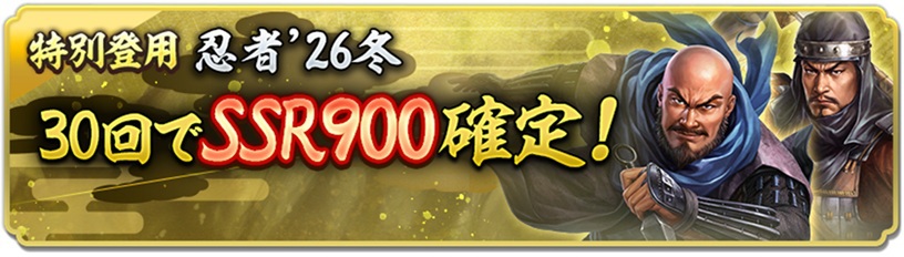 SSR【捕風捉影】風魔小太郎やSSR【槍の正成】服部半蔵など対象のSSR900武将の中からピックアップ武将を1名選択できる「特別登用・忍者 '26冬」を開催。