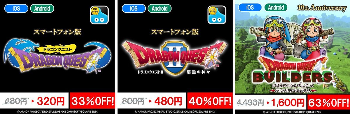 スクウェア・エニックスは1月23日、iOS/Androidで配信中の「ドラゴンクエスト」シリーズのスマートフォン向けタイトルのうち、シリーズの原点となる『ドラゴンクエスト』、2026年1月26日で発売39周年を迎える『ドラゴンクエストII 悪霊の神々』、1月28日で発売10周年を迎える『ドラゴンクエストビルダーズ アレフガルドを復活せよ』の3作品の特別セールを実施。期間は、2026年2月1日まで。