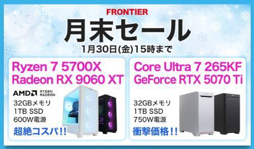 BTOパソコンブランドのFRONTIERでは、月末セールを実施中です。セール対象として、ゲーミング用途を想定したPCが複数ラインアップされています。セール期間は1月30日15時までで、完売時は予告なくモデルの入れ替えや仕様変更が行われる場合があります。