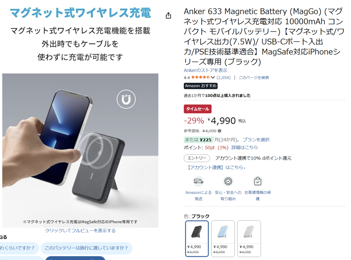 外出先でも家でも便利に使える、AnkerのMagSafe対応モバイルバッテリー「Anker 633 MagGo」が、ただいまセール中です。10000mAhの大容量、マグネット式ワイヤレス充電、USB‑C/USB‑A対応ポート付きで、スマホをよく使う人にぴったり。お得に買えるタイムセール中のため、参考価格6,990円の商品が、29%オフの4,990円で買えます。p>