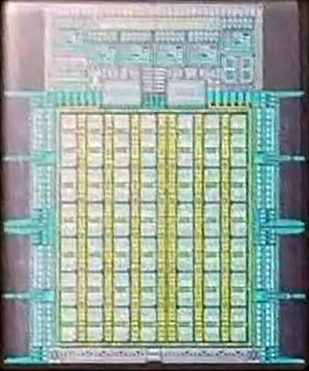 ところで上の画像のダイ部分を拡大して、それぞれの構造を区分けしてみた推定図が下図である。おもしろいのが横7列、縦13列というあまり見ない構造になっていることで、物理的なコア数は7×13=91コアである。おそらく冗長コアが3コアで有効88コアということだろう。モノリシックなダイなので、歩留まり向上を目的とした構成と考えられる。