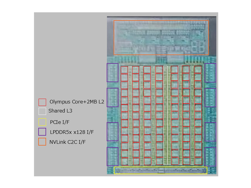 先のGraceの実装模式図(本ページ冒頭の図)でも、L3は縦7列、横12列構造でそのままだと7×12で84個のL3ブロックがあるのだが、実際には12個分の空白があり、合計72個。それぞれが1.625MBの容量を持ち、合計で117MBという不思議な構成なので、VeraもRubinと同じ構造になっている可能性がある。