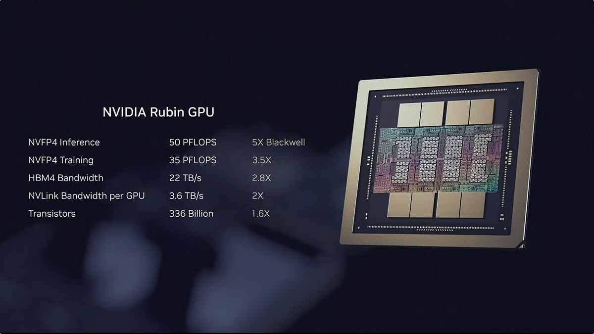 Veraに比べるとまだ謎が多く、情報が示されていないのがRubinである。昨年のGTCのスライドは72 GPUシステムとしての性能であり、今回はRubin単体の性能が示されたのが新しいといえば新しいのだが、まったく新しい情報と言えばトランジスタ数が3360億個であると示された程度だ。