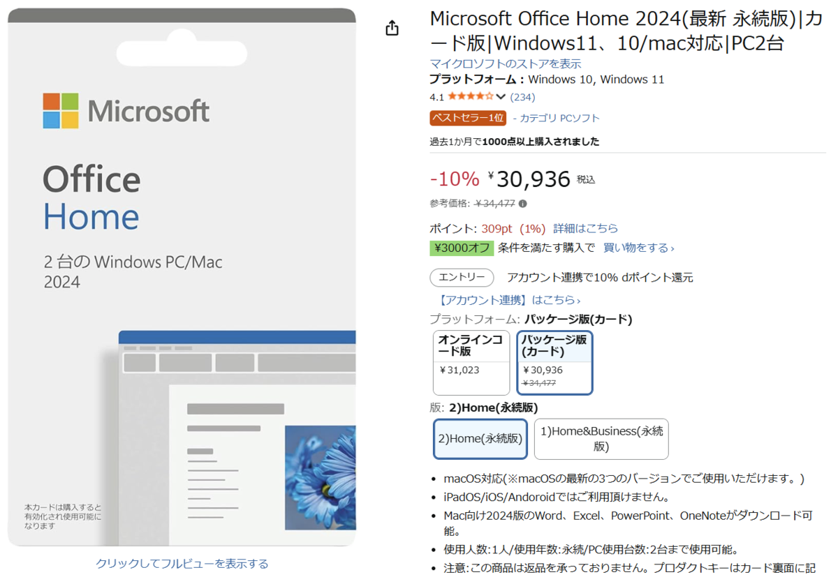 Microsoft Office Home 2024(永続版)カード版が、参考価格34,477円のところ、10%オフの30,936円という魅力的な価格で販売されています。