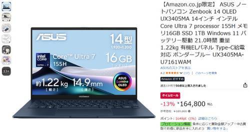 ASUSの14型ノートPC「Zenbook 14 OLED(UX3405MA)」が、Amazonのタイムセール対象になっています。参考価格18万9,800円のところ、13%オフの16万4,800円で販売されています。今回の対象は、Amazon限定のOffice非搭載モデルです。