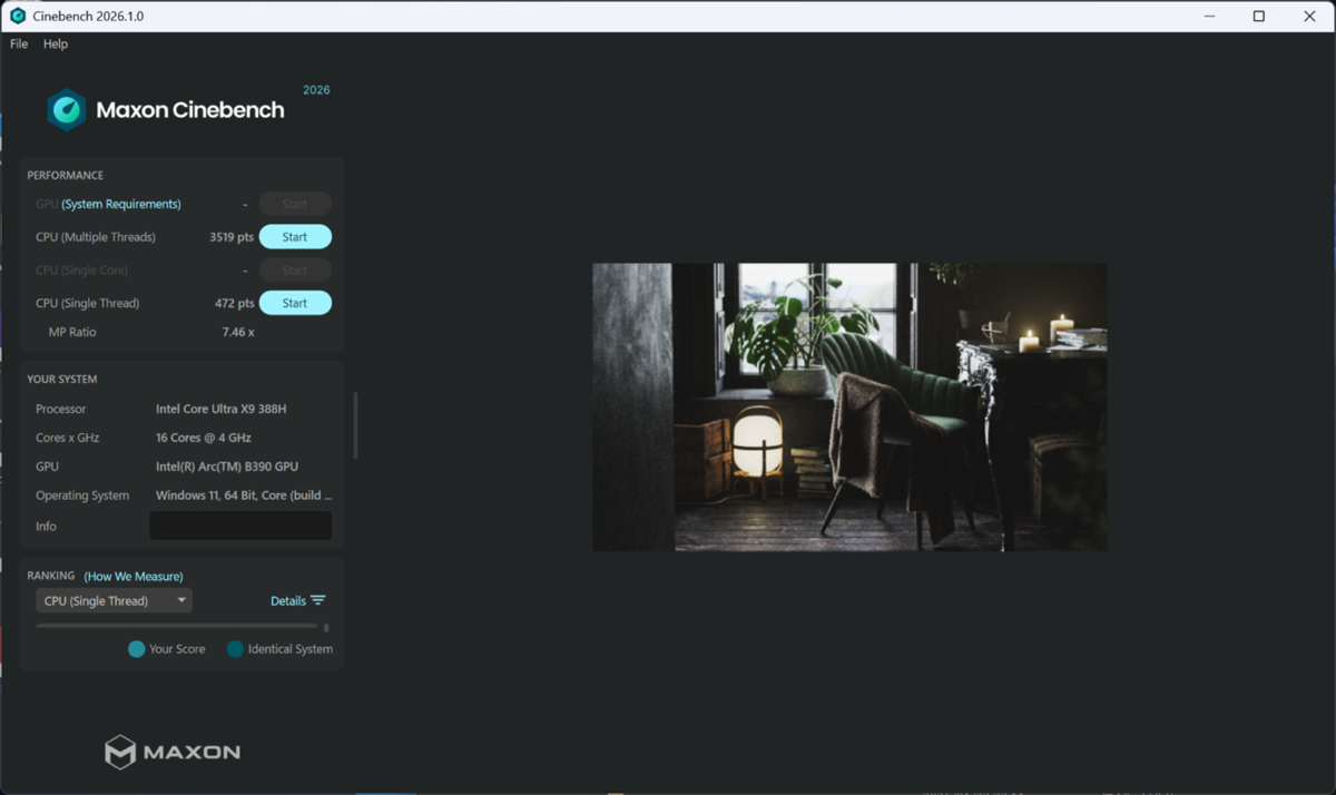 CINEBENCH 2026のスコアー。今バージョンから「マルチスレッド」(Multiple Threads)と「シングルスレッド」(Single Thread)に加え、「1コア」(Single Core)のテストが可能になったが、Core Ultra X9 388Hでは1コアテストは実施できなかった