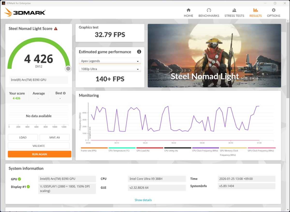 3DMark:Steel Nomad Lightのスコアー。中央上にある「140+ FPS」とは、「Apex Legends」の「フルHD&高画質設定」で140fps以上は出せる「可能性がある」というもの。ただし、このデータは3DMarkのデータベースから推定したものであるため、実際にそこまで出せるという保証ではない