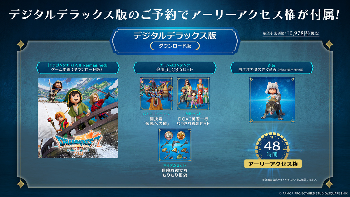 スクウェア・エニックスは1月23日、2月5日に発売予定の「ドラゴンクエストVII Reimagined」(リイマジンド)について、アーリーアクセスに関する注意喚起を出した。場合によっては「デジタルデラックス版」の特典である48時間先行して遊べるアーリーアクセスが利用できないことがあるという。