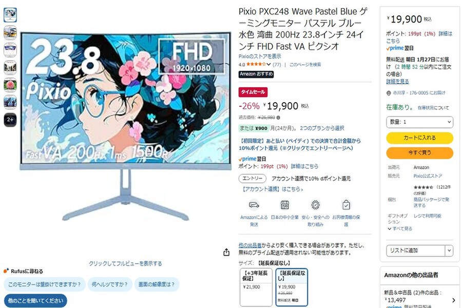 Amazon.co.jpにて、Pixioのゲーミングディスプレー「PXC248WAVEB」(延長保証なし)が販売中だ。過去価格は2万6980円だが、タイムセールにより26%オフの1万9900円で購入できる。