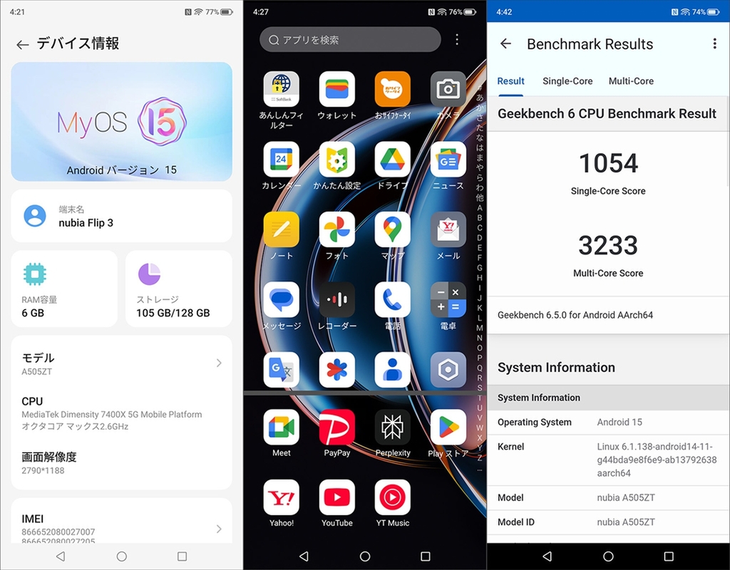 nubia Flip 3の全体的な操作感をお伝えしたい。まず、OSはAndroid 15をベースにしたMyOS 15を搭載している。AIによるシステム制御(バッテリーなど)、AIライティングといったアシスタント機能も搭載されている。