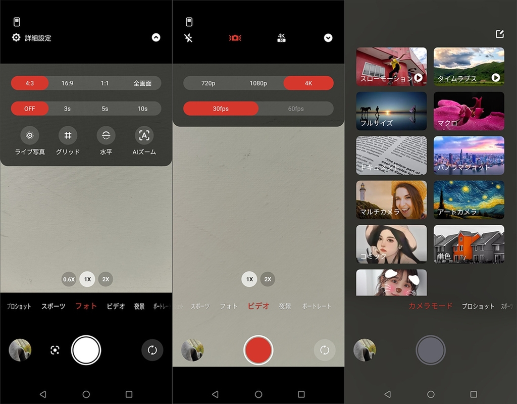 カメラアプリは、画面上から下にスワイプすることでクイック設定パネルが表示される。ウォーターマークの設定もできるが、機種名の文字が入るだけで凝ったものではない。動画は4K 30fpsまでに対応。またnubiaのカメラフォンに倣い、特殊な撮影モードが多数プリインストールされている。