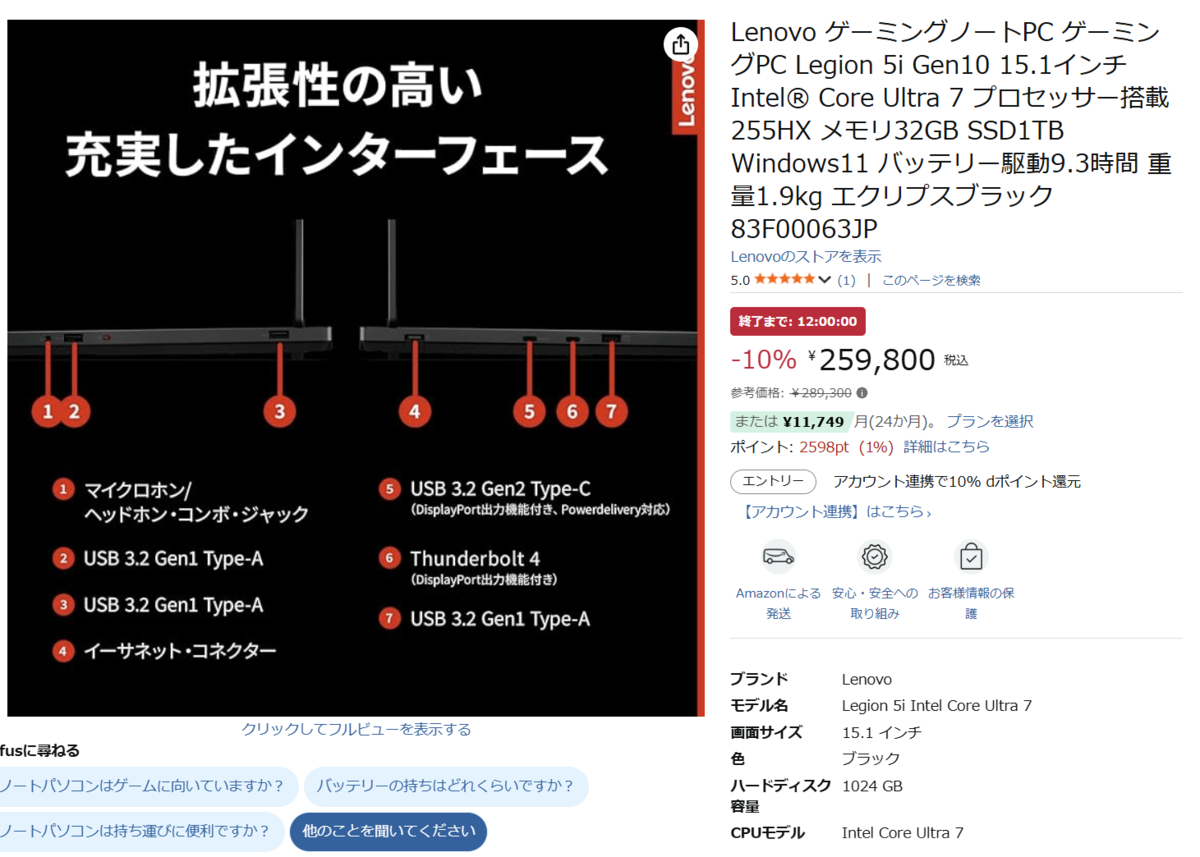 Amazonでは本日(1月27日)より2月2日まで定期的なセール「AmazonスマイルSALE」を実施していますが、Legion 5i Gen 10(83F00063JP)はタイムセールの扱いで、期間は本日いっぱいのようです。