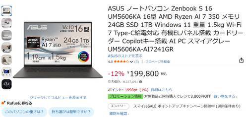 ASUSの16型ノートPC「Zenbook S 16 UM5606KA」が、Amazonで割引対象になっています。参考価格227,091円のところ、12%オフの199,800円で販売中です。