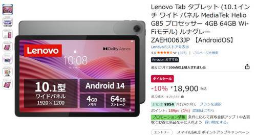 Lenovoの10.1型Androidタブレット「Lenovo Tab(ZAEH0063JP)」が、Amazonのタイムセール対象になっています。過去価格21,111円のところ、10%オフの18,900円で販売中です。