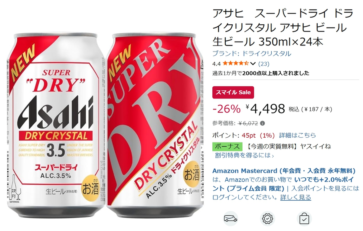 「アサヒ スーパードライ ドライクリスタル 350ml×24本」は、コクと透明感のある後味を特長とするビールです。現在、Amazonスマイルセールの対象商品となっており、割引価格で販売されています。