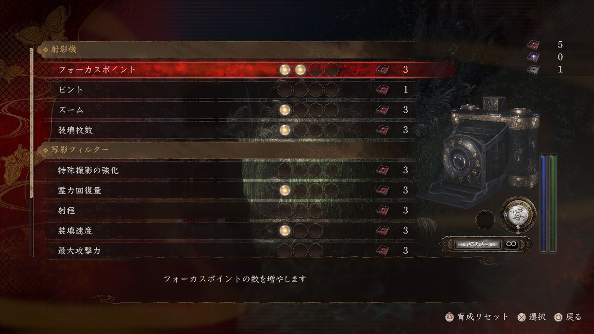 探索中にアイテム「念珠」を入手することがある。「念珠」を使うと「射影機」・各フィルターの性能を強化できる。射影機強化にはフォーカスポイントの数を増やしたり、装填速度を速くしたりするなど、さまざまな強化が可能だ。