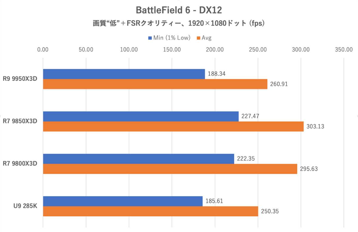 全体傾向はARC Raidersと似ているが、よりRyzen 7 9850X3Dと9800X3Dのフレームレートが突出している形となった。むしろコア数の多いRyzen 9 9950X3DやCore Ultra 9 285Kはまったく奮わない。ゲームのCPU負荷が高めなためRyzen 9 9950X3Dは一見有利なようだが、ベースクロックが低く、さらに3D V-Cacheを持たない方のコアに処理が割り振られてしまった場合のレイテンシーが大きくなる、などの要因がハンデとなっていると推察される。