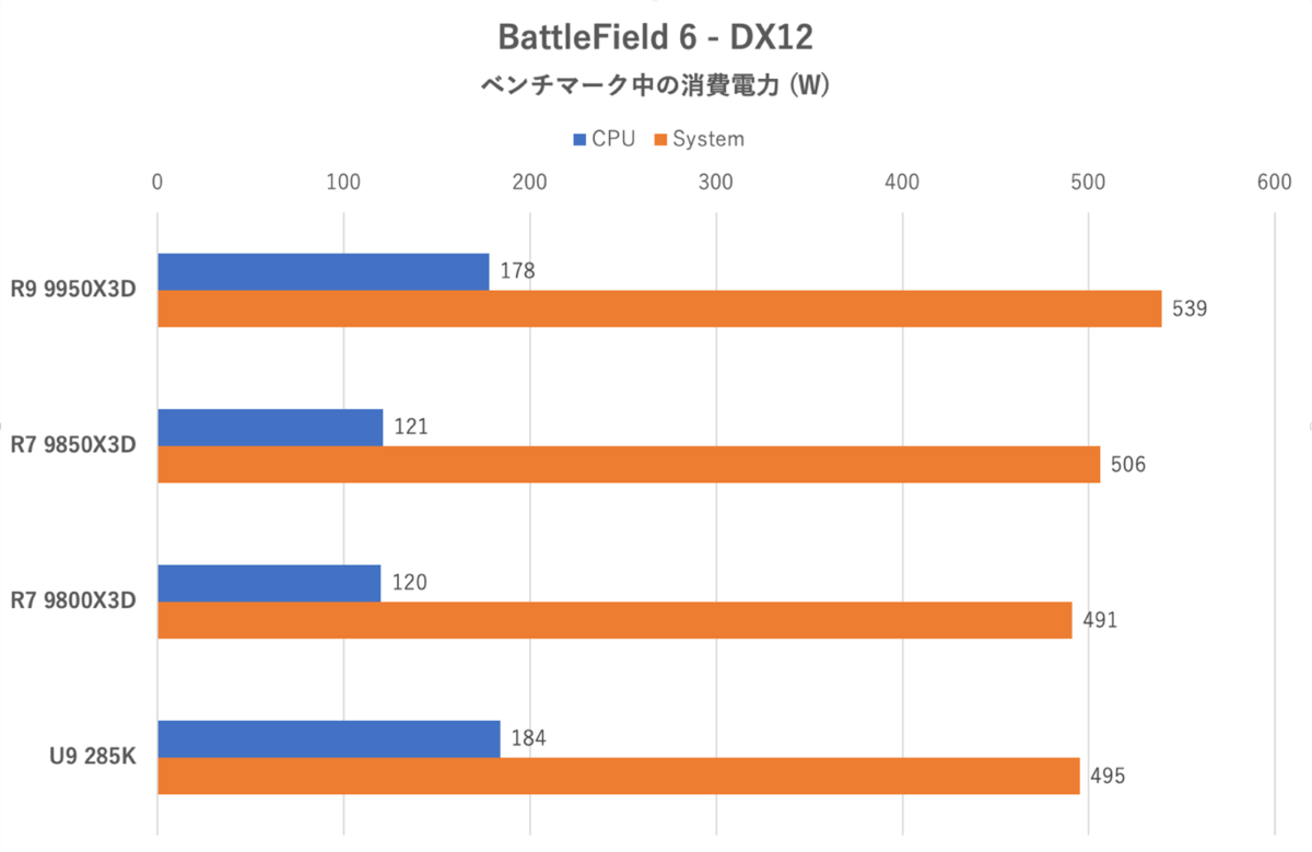 BattleField 6は予想以上にCPUの電力を食うことがこのグラフで示されている。Ryzen 9 9950X3Dで平均120W、Ryzen 9 9950X3Dは平均180W近く消費している。このような負荷では、どのCPUコアからでも3D V-Cacheを活用できるRyzen 7 9850X3Dや9800X3Dが有利なようだ。ただRyzen 7 9850X3Dは9800X3Dにフレームレートでほぼ並ばれているが、CPUの消費電力が非常に大きいため、電力制限のおかげで性能を出し切れていないようだ。