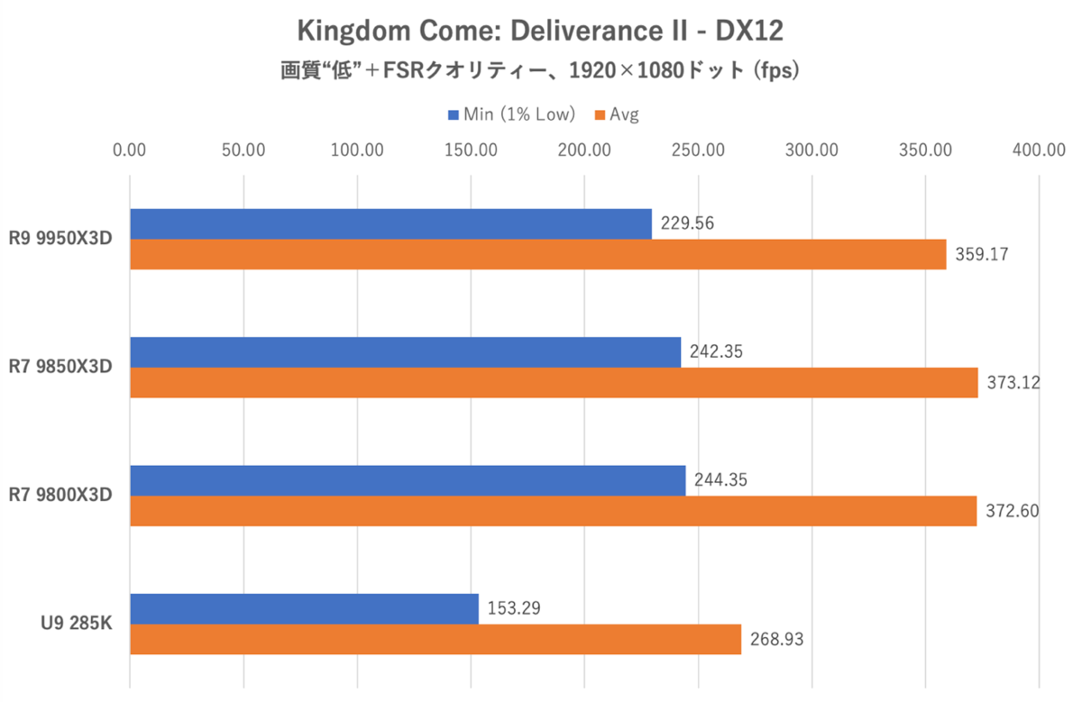 このゲームは極力同じ状況に持っていってもフレームレートがブレやすい(MobやNPCの動きが統一できない)が、まあこんな感じかなというデータが上のグラフだ。Ryzen 7 9850X3Dは9800X3Dよりもフレームレートがわずかに伸びるという印象。ただ今回のテストではRyzen 9 9950X3Dがトップだった。コア数の多いRyzenはゲームで弱い印象があるが、そうでない例もある、というわけだ。Core Ultra 9 285Kに関しては、コア数のわりにとても残念と言わざるを得ない。