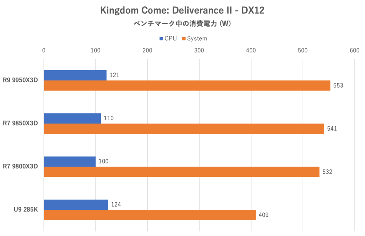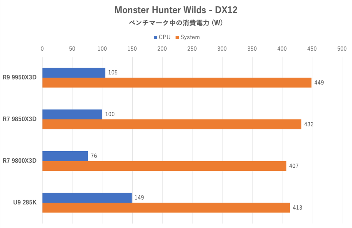 この消費電力のデータからは、アップデート前のMonster Hunter WildsのCPUの使い方に奇妙な点があることがなんとなく読み取れる。Ryzen 7 9850X3Dと9800X3Dの違いはクロック上昇分と言えるが、Ryzen 9 9950X3Dは逆にCPU消費電力がやや少なめ(効率良く処理しているだけかもしれない)。そしてCore Ultra 9 285Kは逆に消費電力が不自然に大きく、なにか非効率的な処理をしているようにも見える。