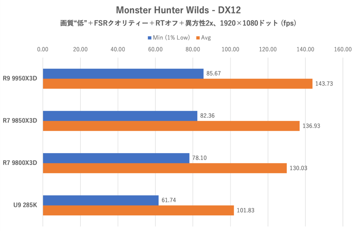 Monster Hunter Wildsはアップデートの止まったベンチマーク専用アプリではなく、実ゲームを使用。画質は「低」、異方性2x、レイトレーシングはオフに設定した。「緋の森」のベースキャンプから一定のコースを移動した際のフレームレートを計測した。この検証はCPU負荷に関する挙動を改善するアップデート前に実施したため、全DLCを導入しDLCチェックによる性能低下を回避した状態で計測している。