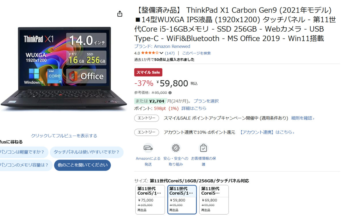 【AmazonスマイルSALE】ThinkPad X1 Carbonが59,800円(整備済み品)、在庫と表示は要チェック