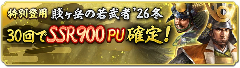 SSR【虎之助】加藤清正とSSR【勇往直突】福島正則(いずれも初期威名900)がピックアップされる「特別登用・賤ヶ岳の戦い」を開催。開催期間は、2026年2月19日12時59分まで。