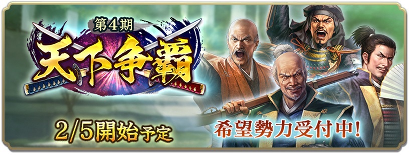 「天下争覇 第4期」希望勢力受付期間は、2026年2月4日12時59分まで。「天下争覇 第4期」開催期間は、2月5日メンテナンス終了後~2月26日12時59分までだ。