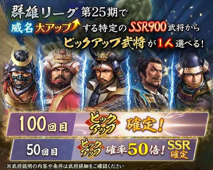 「特別登用・群雄 第25期」では、対象の「武田家」「真田家」のSSR初期威名900武将の中から、いずれか1名をピックアップ武将として選択可能。