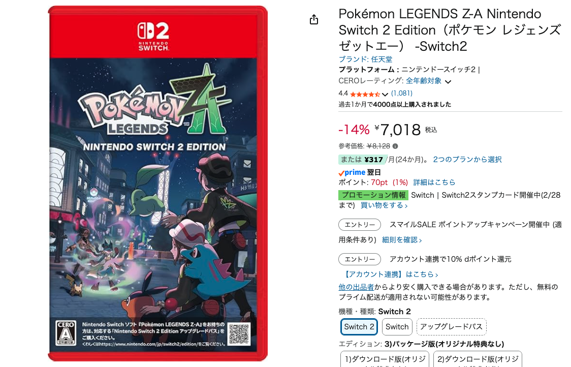 そんな私がオススメしたいゲームタイトルは、「Pokémon LEGENDS Z-A Nintendo Switch 2 Edition」です。パッケージ版の参考価格は8,128円ですが、今なら14%オフの7,018円でAmazonから購入できます。