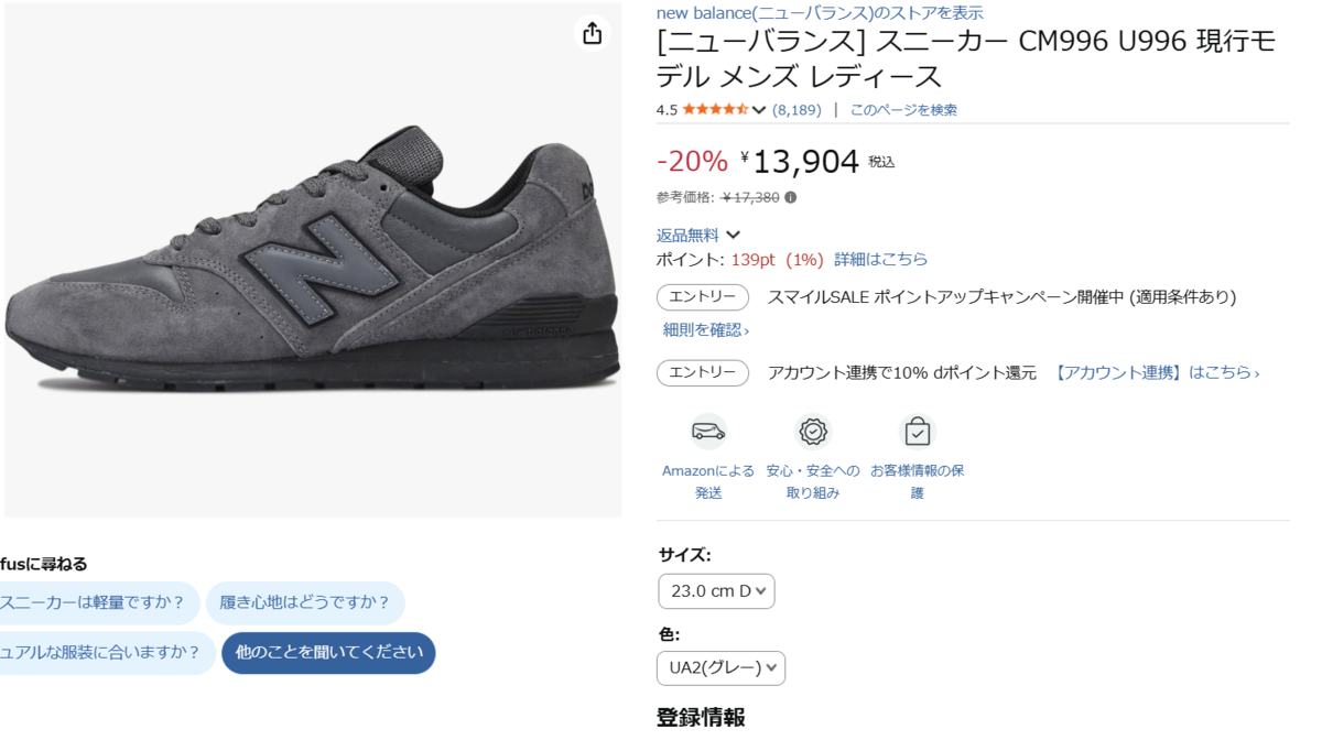 ニューバランスの「CM996/U996」系は、デザインの完成度が高く、流行に左右されにくいのが魅力です。一方で、Amazonではカラーやサイズによって価格や割引率が異なることがあるため、購入前には必ず販売ページの表示条件を確認しておきたいところです。参考価格との比較や、返品可否の表示までチェックしておくと、より安心して選べます。